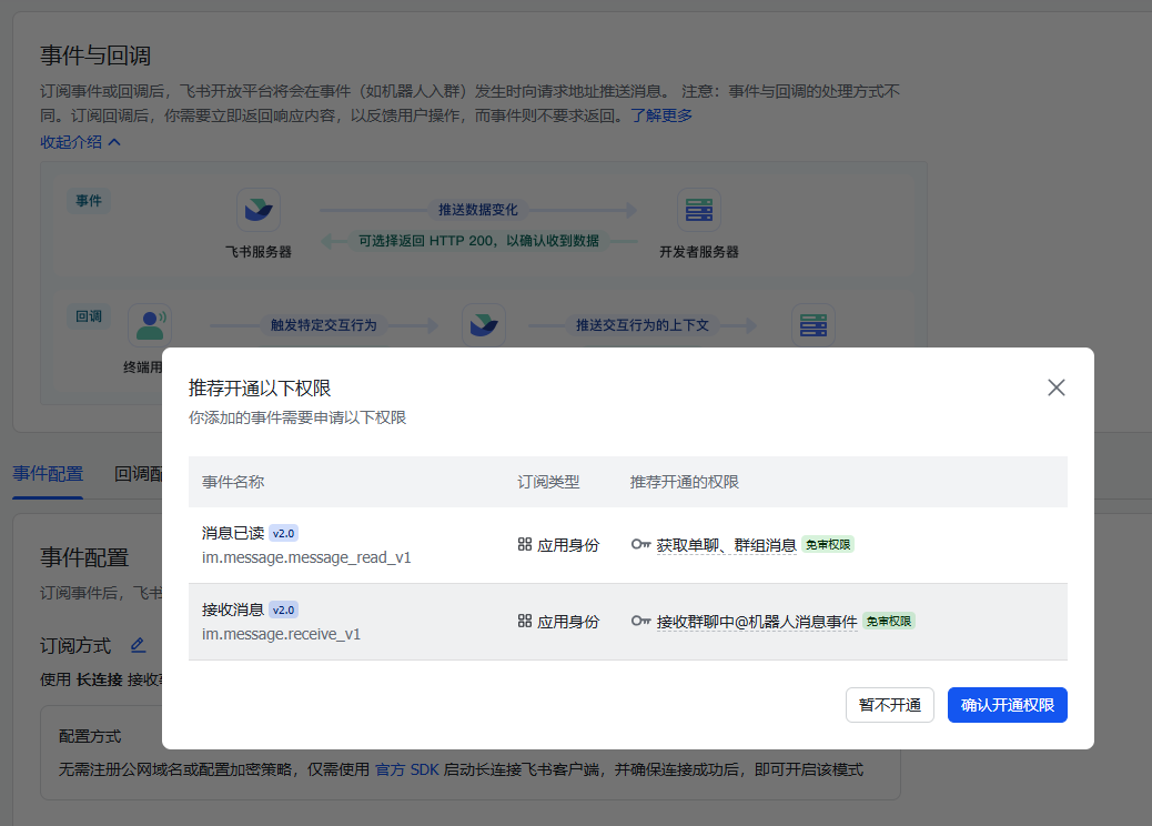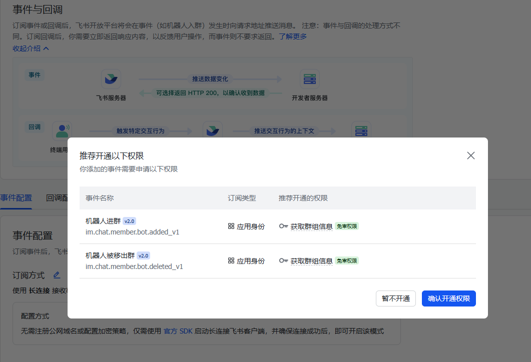 订阅事件或回调后,飞书开放平台将会在事件(如机器人入群)发生时向请求地址推送消息。 注意:事件与回调的处理方式不同。订阅回调后,你需要立即返回响应内容,以反馈用户操作,而事件则不要求返回。