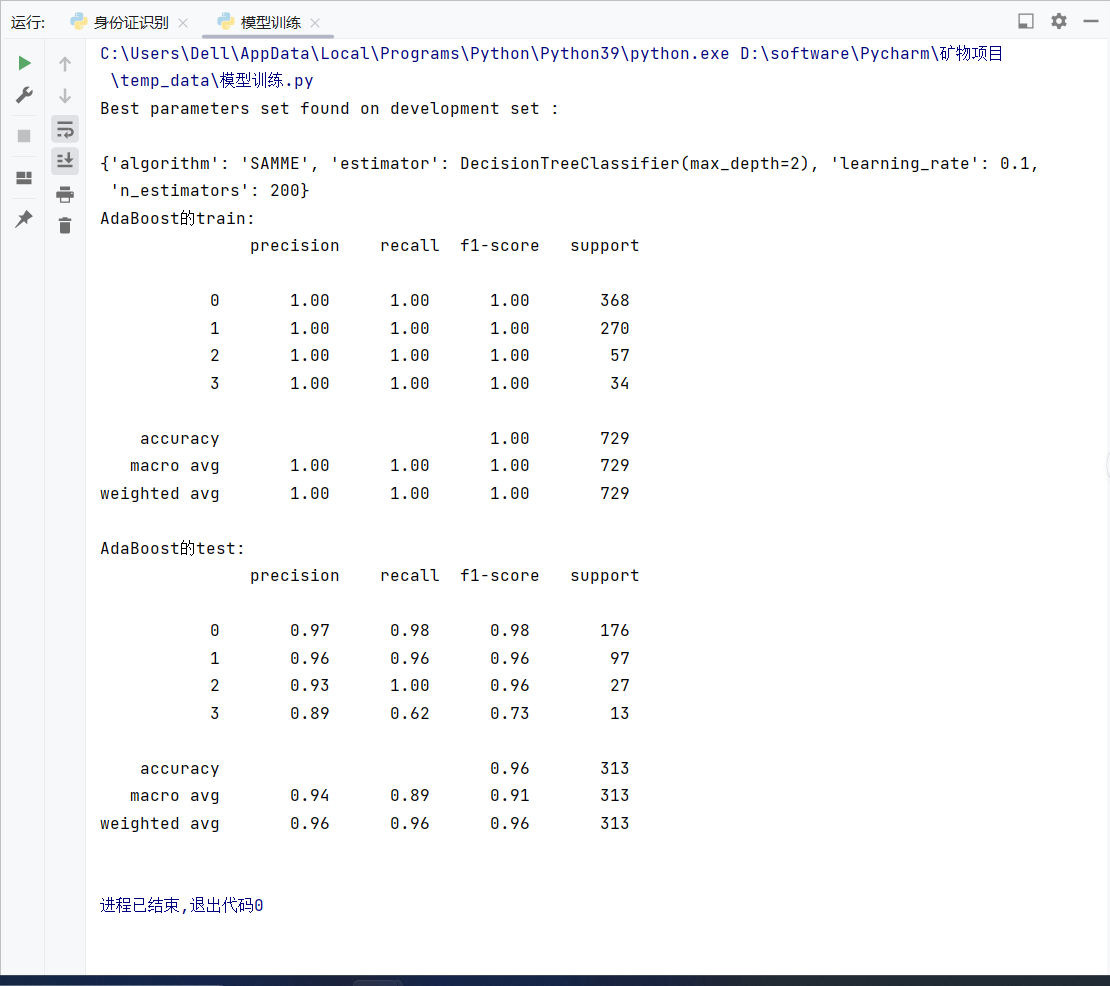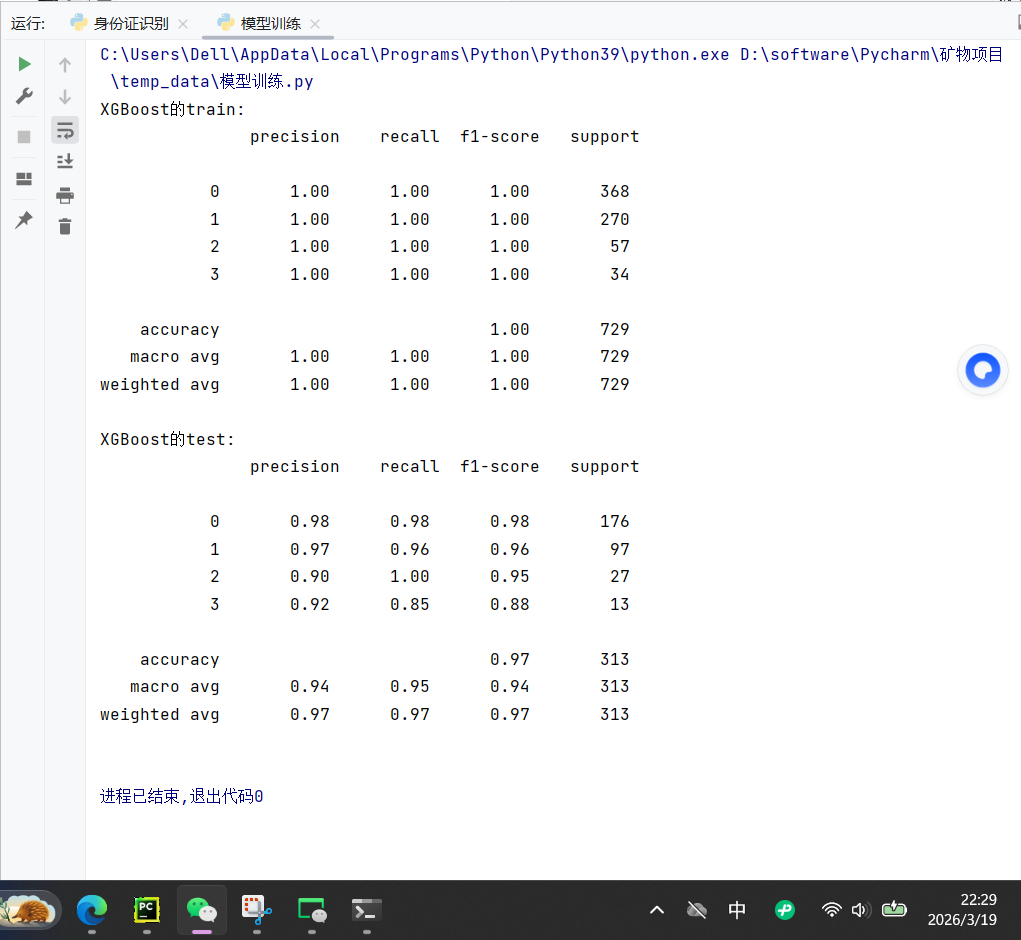 XGBoost 模型在你的矿物分类数据集上表现极佳,训练集完全拟合,测试集准确率高达 97%,是目前最优的分类模型