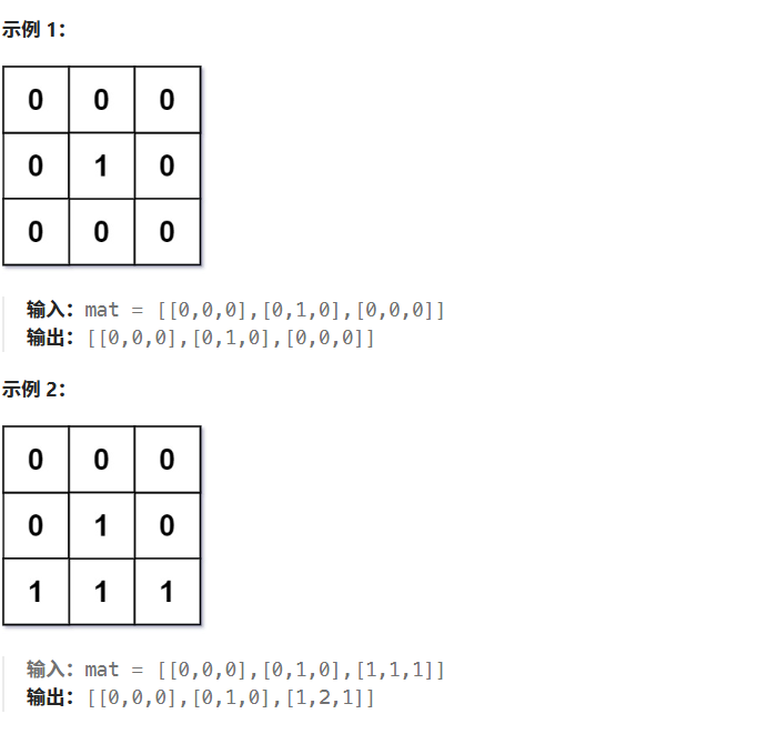 给定一个由 0 和 1 组成的矩阵 mat ,请输出一个大小相同的矩阵,其中每一个格子是 mat 中对应位置元素到最近的 0 的距离。