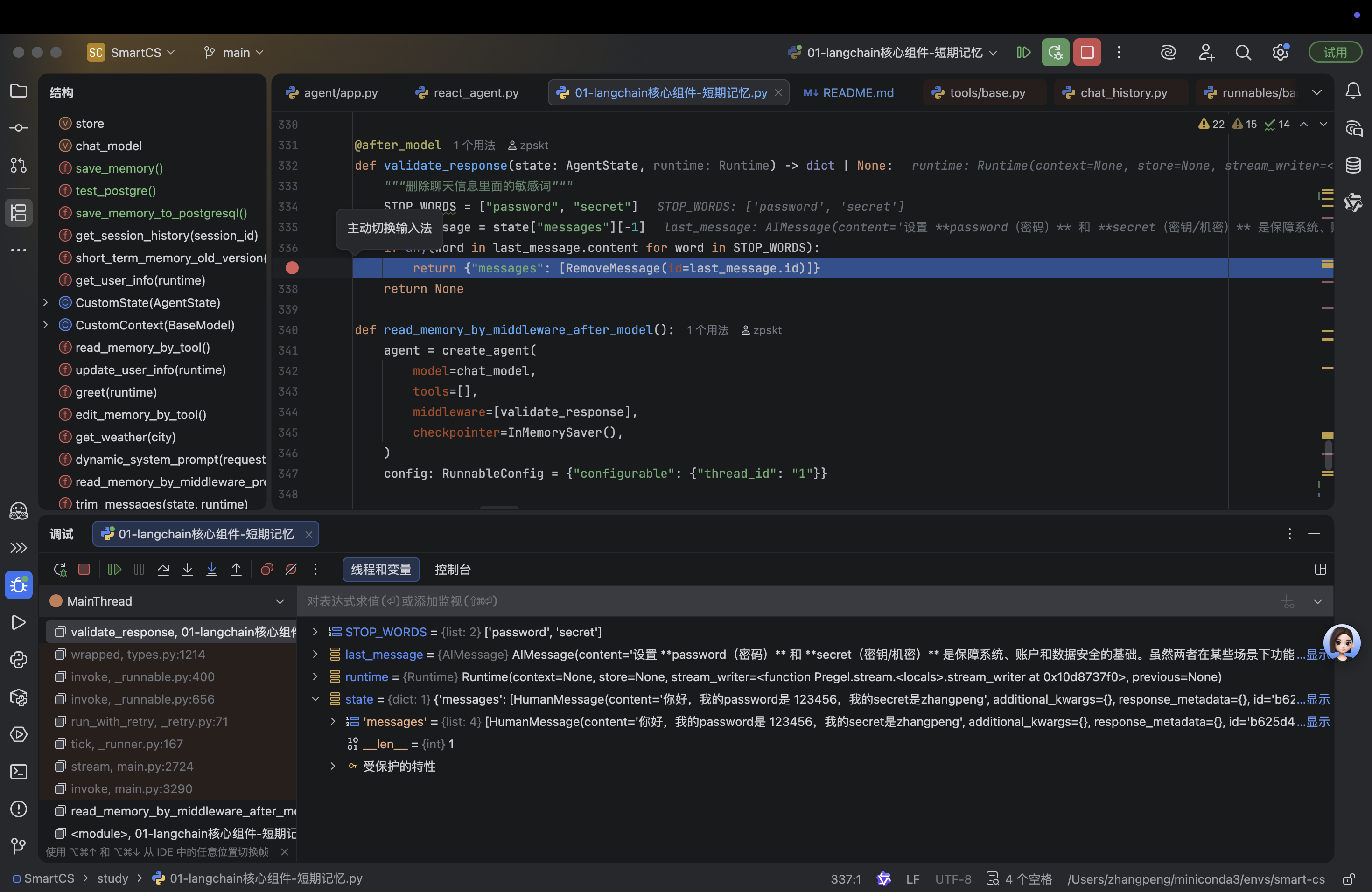 这种方式是保存到内存中,langchain会自动帮我们进行维护,在调用agent.invoke里面的configurable是必填的,这块的内存也是根据thread_id存储。