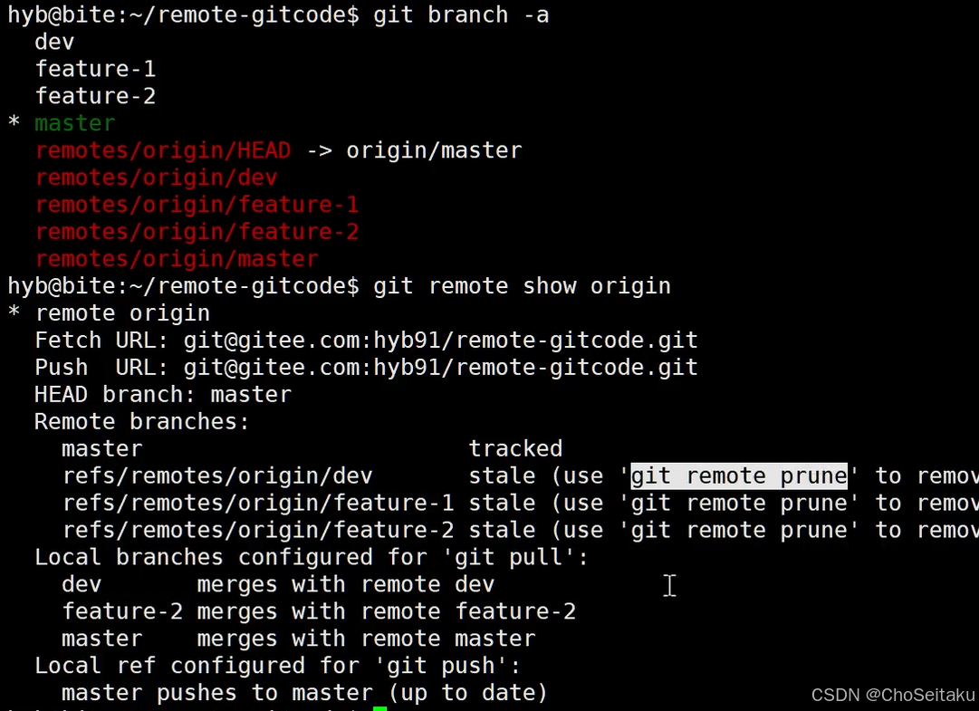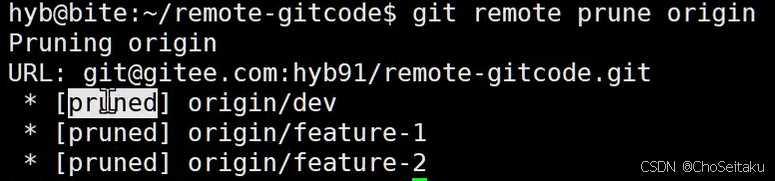 此时我们可以看到那些远程仓库已经不存在的分⽀,根据提⽰,使⽤ git remote prune origin 命令