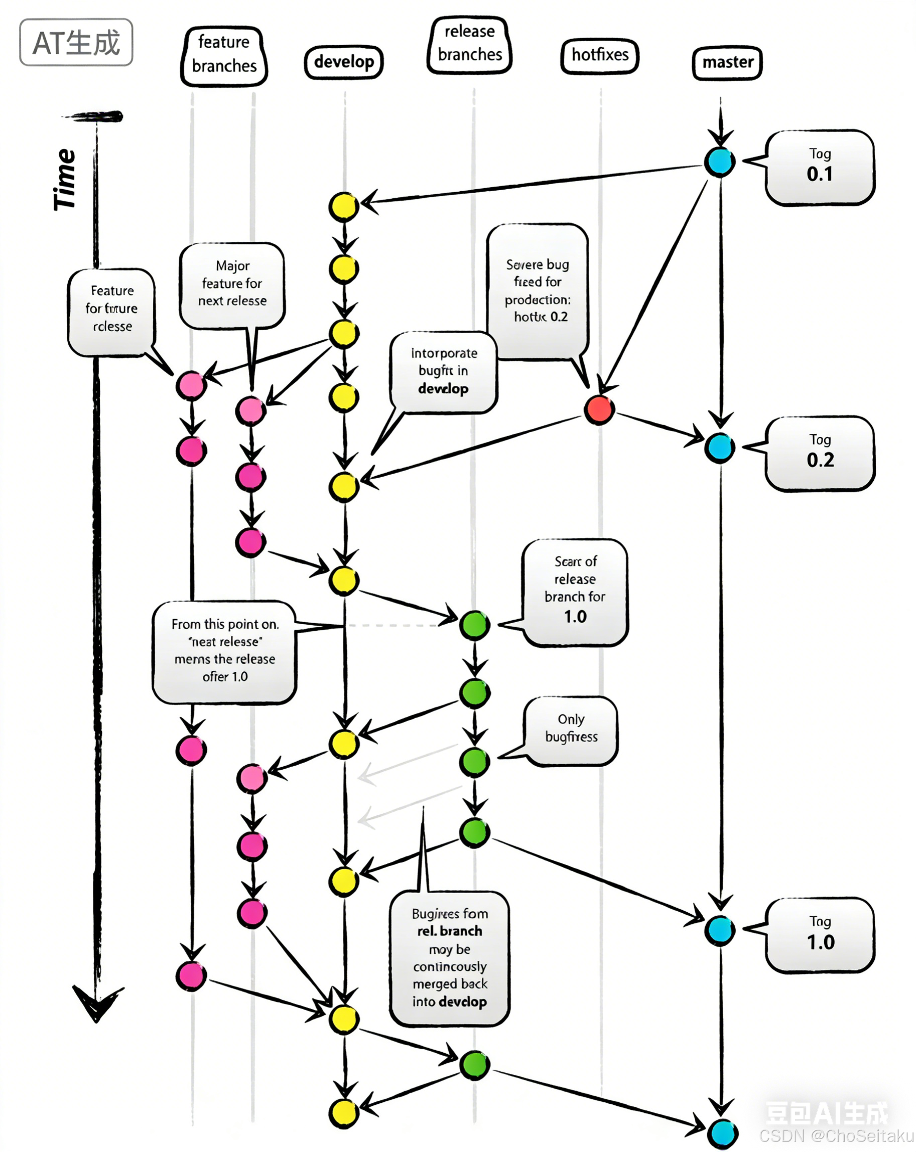 - develop 为开发分⽀,基于master分⽀创建的只读且唯⼀分⽀,始终保持最新完成以及bug修复后的代码。可部署到开发环境对应集群。