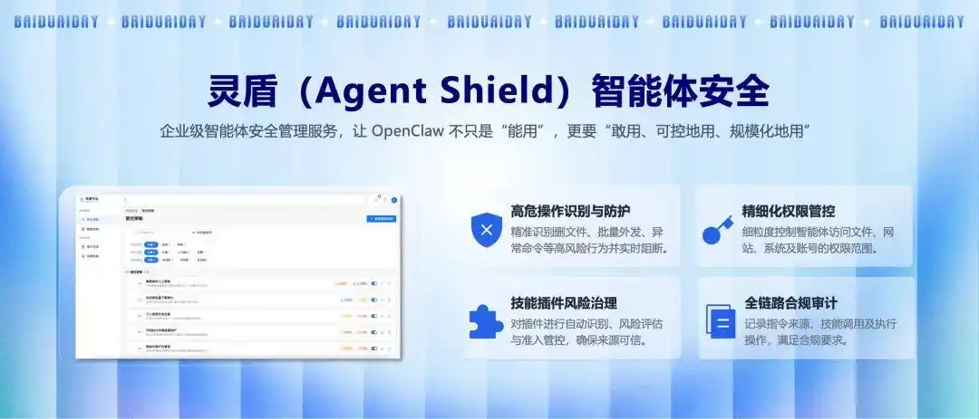 为实现企业级的安全管理服务,季石磊介绍了百度开发的灵盾智能体( Agent Shield ),它像一道安全防护栏,能识别高危操作并防护、管控精细化权限、治理技能插件风险和全链路合规审计,让 OpenClaw 不只是"能用",更能"敢用、可控地用、规模化地用"。