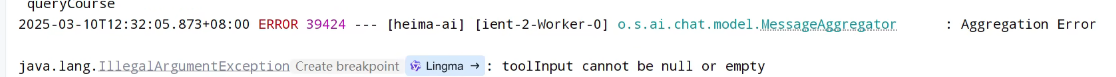 这是非法参数异常,指的是工具输入是非法的,因为使用的模型是openAi的API,但是实际模型是阿里百炼的大模型,虽然说阿里百炼兼容openai,但是实际兼容的并不优秀。