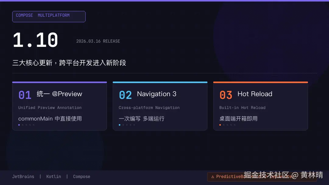 Compose Multiplatform 1.10 = 统一 Preview + Navigation 3 + Hot Reload,跨平台 UI 开发进入新阶段。