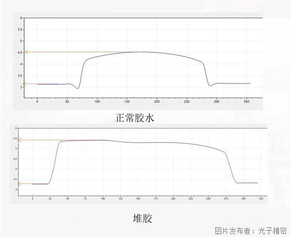 在点胶过程中,GL-8000的在线检测功能可实现多维度、全方位的胶路质量管控,具体检测内容涵盖三个核心方面:一是胶宽与胶高检测,通过提取胶体横截面轮廓,精准计算实际胶宽与胶高,并与预设标准(如高度0.15mm±0.01mm)进行实时比对,确保胶路尺寸符合设计要求;二是缺陷检测,通过算法分析自动识别断胶、堆胶、塌边、胶路偏移等常见工艺缺陷,确保胶路的完整性和一致性;三是体积计算,通过积分算法精准计算整条胶路的胶水体积,实时监控胶阀吐出量的稳定性,避免因吐出量偏差导致的胶路过宽、过窄或断胶等质量问题。