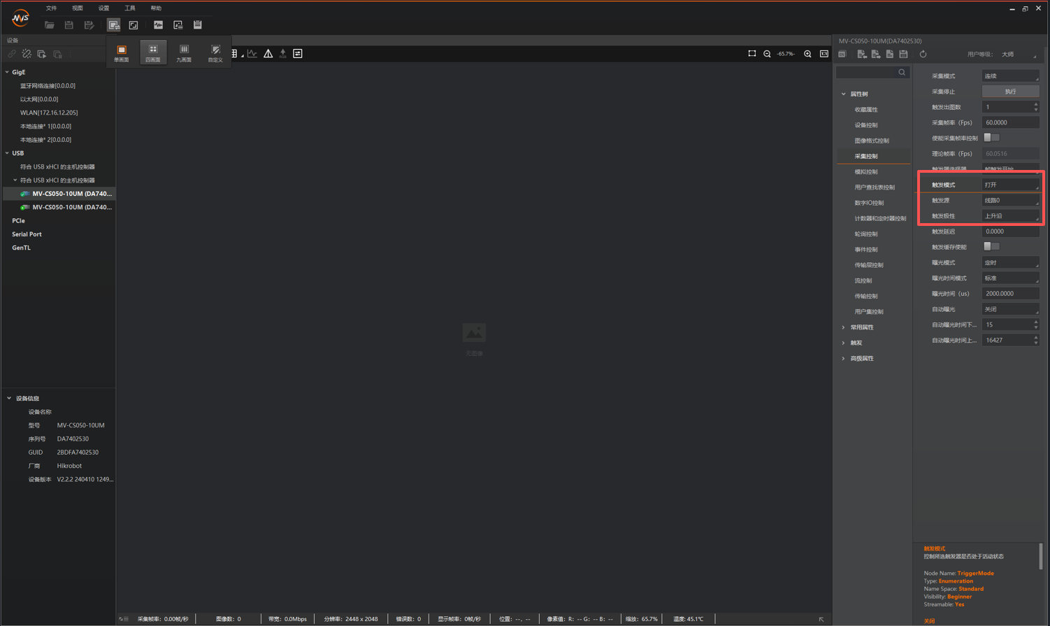 相机控制使用海康的MVS软件。需要和投影仪同步拍摄时,将相机设为外触发模式。