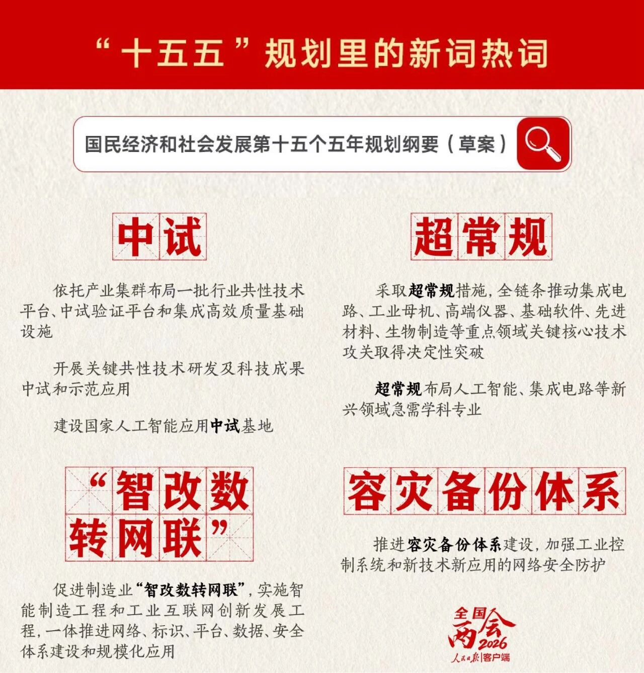 2026年全国两会明确将具身智能与量子科技、6G、脑机接口等并列列为重点培育的未来产业,政府工作报告提出建立未来产业投入增长和风险分担机制,引导资本、人才等优质资源集聚,降低企业研发试错成本,为全国产化具身智能技术攻关、产品规模化落地营造了一流产业环境,也为民营企业参与核心技术研发注入坚定底气。工业和信息化部部长李乐成在两会部长通道明确提出,要大力推动人工智能和制造业"双向奔赴"。在"十五五"规划里也出现了不少新词热词,包括"智改数转网联""容灾备份体系""中试""超常规"等。