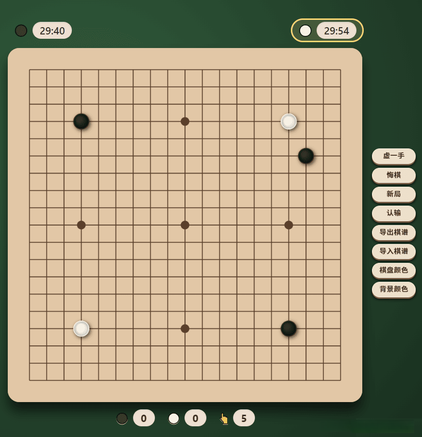 2. 虚一手(Pass) 点击"虚一手"按钮表示当前玩家放弃落子,轮由对方行棋。虚手也会记录在历史中,便于连续虚手后的协商终局。3. 悔棋 点击"悔棋"可逐步回退至上一手棋前的状态(包括提子数、手数、计时器均回退)。程序内部维护完整的历史栈,确保悔棋逻辑准确。4. 认输 点击"认输"立即结束对局,弹出胜负提示,计时停止,棋盘锁定。5. 新局 重置所有状态:棋盘清空、计时重置为 30 分钟、提子与手数归零、历史清空,并由黑方先手开始计时。