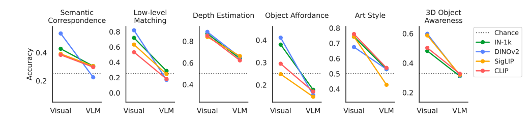 开源 VLM 在许多任务上表现出色,尤其是那些依赖 LLM 内部专家级知识的任务。然而,当 VLM 需要完全依赖图像而非背景知识 时,其表现会大幅下降,往往仅达到随机水平。令人困惑的是,之前的研究表明,这些嵌入在 VLM 中的大型视觉模型,在单独对其表示进行探测(Probing)时,在这些"视觉中心任务"上表现极其优异。此外,我们观察到视觉编码器的性能与其对应的 VLM 在这些任务上的表现毫无相关性 ;最强的视觉表示(通常是 DINOv2)在作为 VLM 内部组件时,往往表现不佳。为了理解这一现象,我们将 VLM 与其视觉编码器进行对比。我们将测试基准定义为**"以视觉为中心"的任务**:即纯粹依靠视觉输入即可解决、无需领域知识的任务。这排除了对 LLM 知识的依赖,更聚焦于视觉表示。我们分析了三个潜在的失效点:视觉表示质量、对提示词的敏感度,以及语言模型利用视觉表示的能力。