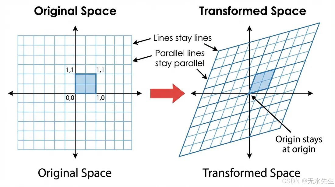 图 3:线性变换保持直线和平行性------想象一张带有网格的橡胶片,它可以拉伸和扭转,但永远不会弯曲或折叠。