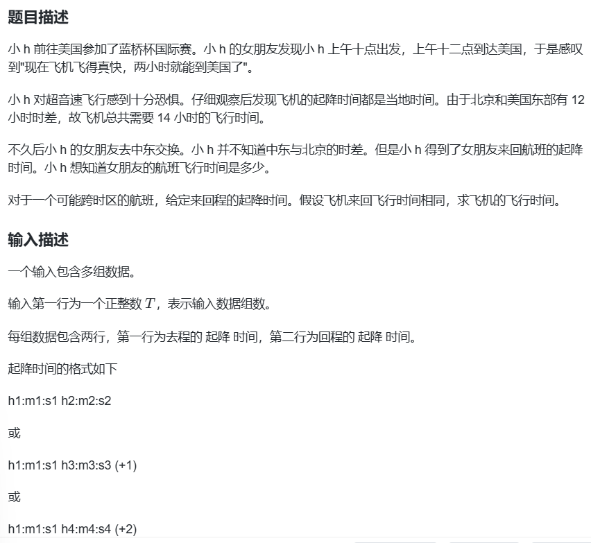 思路:时差可以被消掉 ,例如我们假设a,b两地的时差为t 当飞机在a地 t1 时刻起飞此时b地的时间为t1+t 我们假设需要经过B时间飞机能从a->b则飞机到b地的时间为 t1+t+B ,题目给力我们飞机到b地的时间是t2则 t2=t1+t+b ,同样我们可以推导出 t3-t+B=t4 其中t3是飞机从b地起飞的时间t4是飞机到a地的时间 ,两者相加就把时差t给消掉了