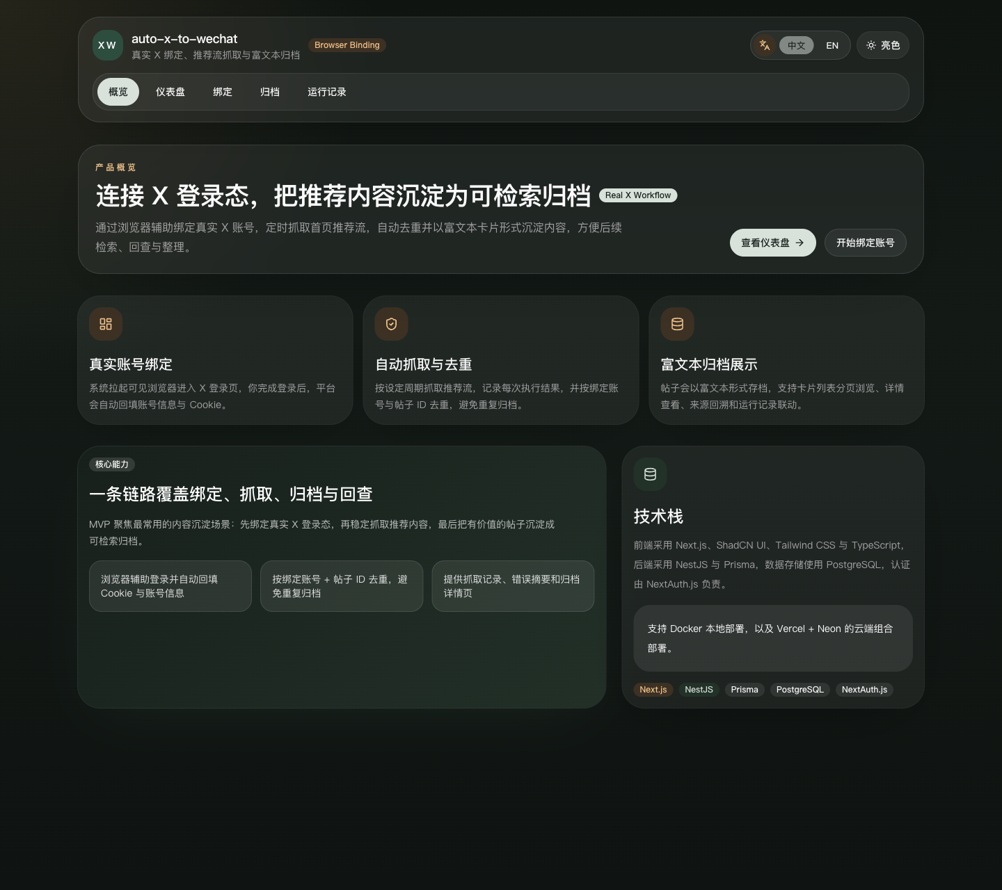 如果你平时会在 X 上刷到不少有价值的内容,但又苦于内容流转太快、后续难检索、难沉淀,那这个项目值得看一眼。它做的不是简单"抓几条数据展示一下"的 Demo,而是围绕"真实账号绑定 -> 定时抓取推荐流 -> 去重归档 -> 富文本展示 -> 运行记录回查"这条链路,做出了一套比较完整的 MVP。