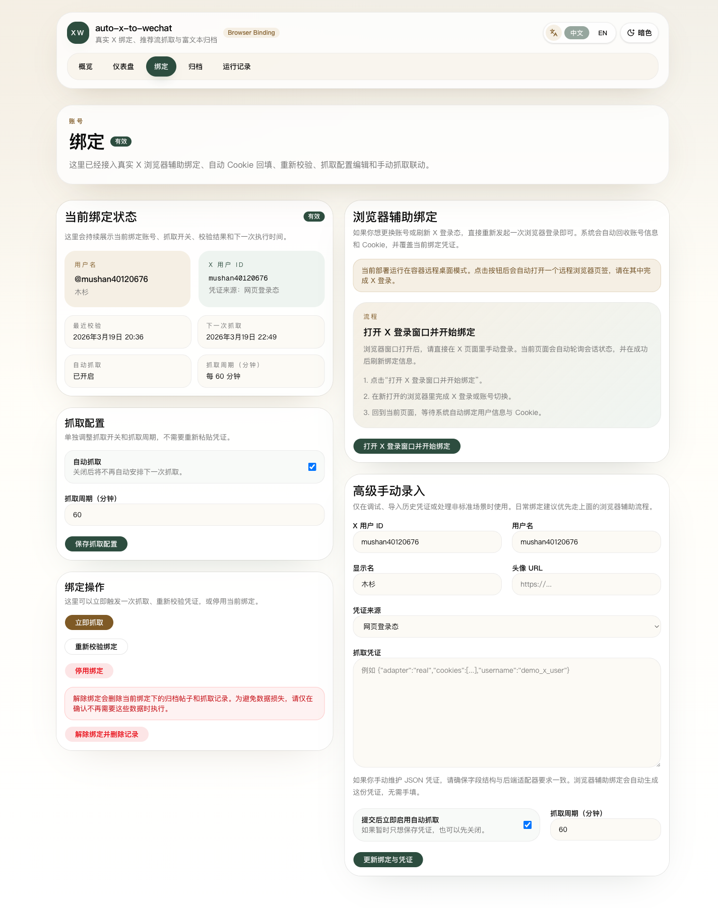 不是只让你手动填 Cookie,而是通过浏览器辅助绑定的方式,让用户手动登录 X,系统再自动回填账号信息和 Cookie。这个设计很重要,因为很多相关项目停留在"需要用户自己导 Cookie"的阶段,真实可用性并不高。