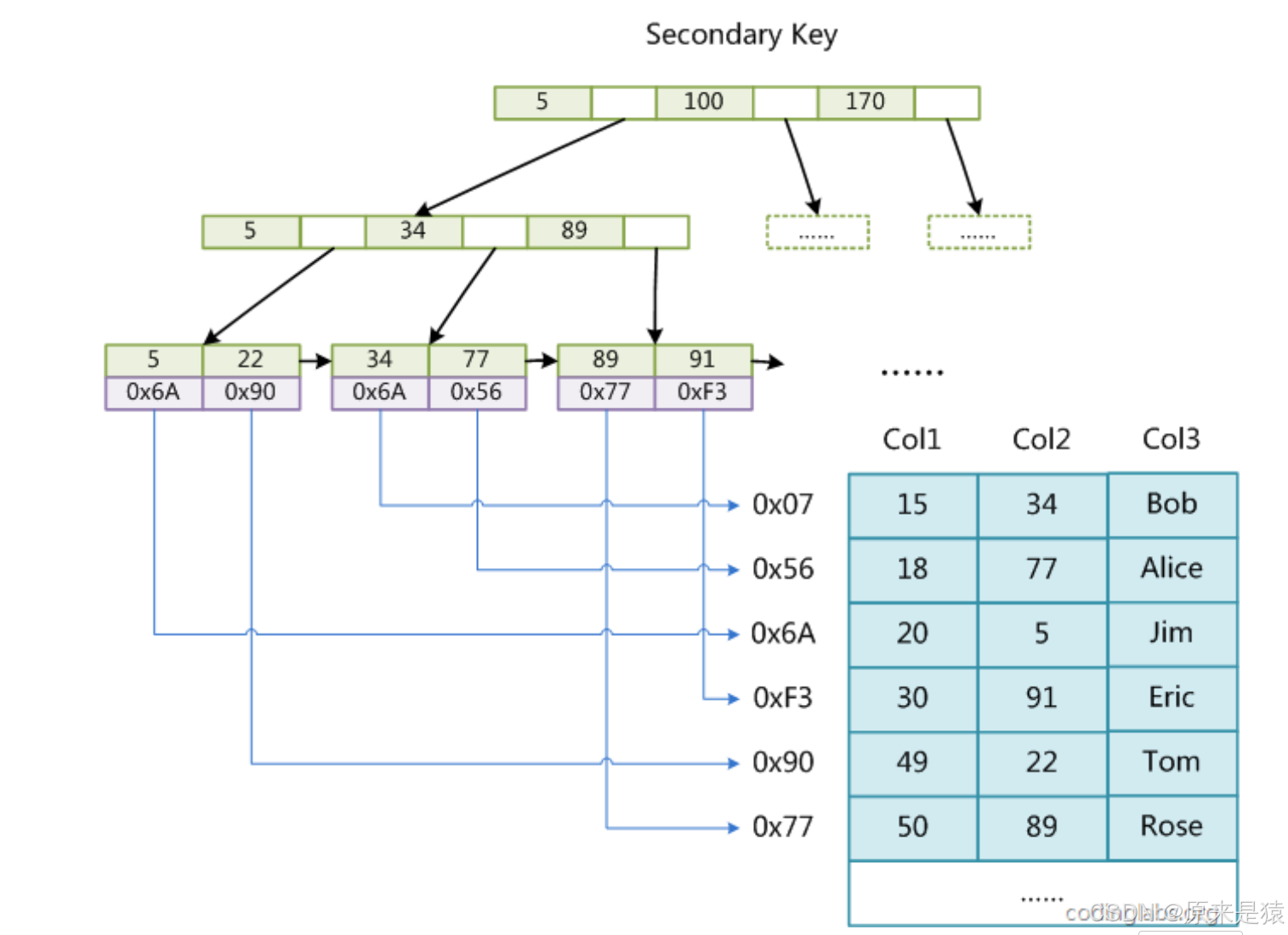 | B树 | 非叶子节点也存数据,导致单个节点能存的键值少,树更高;叶子节点不相连,范围查询效率低 |