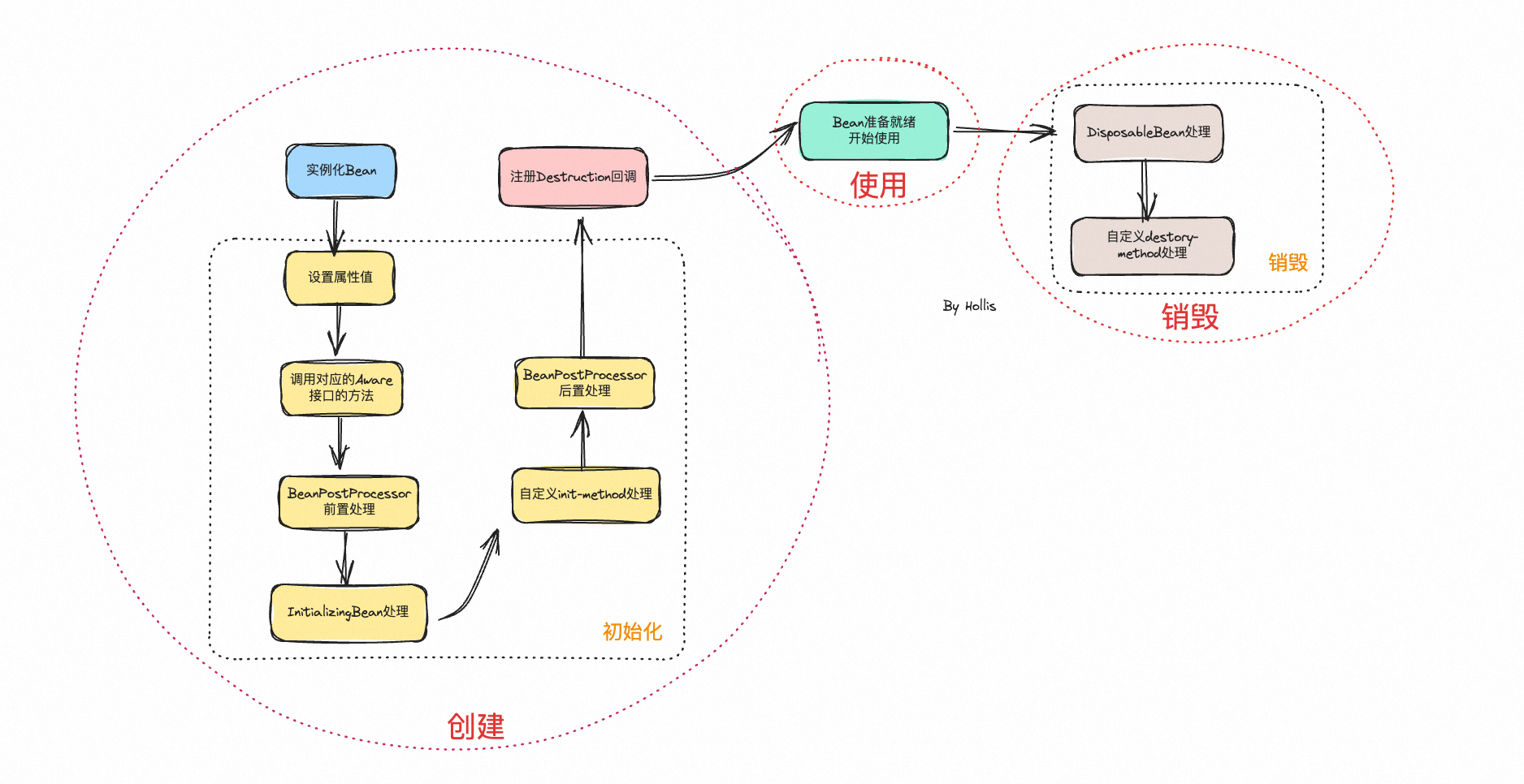 进一步分细化就是 实例化、初始化、注册Destruction回调、Bean的正常使用以及Bean的销毁。