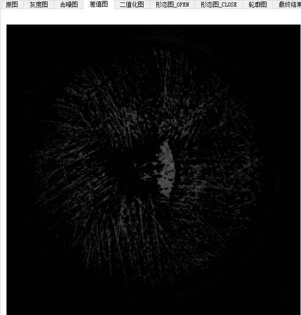 处理流程:原图-》转为灰度图-》中值滤波提取背景图-》背景图-灰度图,得到目标区域和划痕区域-》二值化-》形态学-》轮廓寻找,排序-》绘制轮廓。