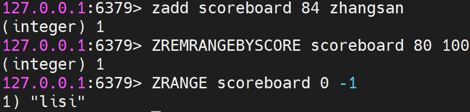System.out.println("按分数删除 80-100:" + zremByScoreCount);