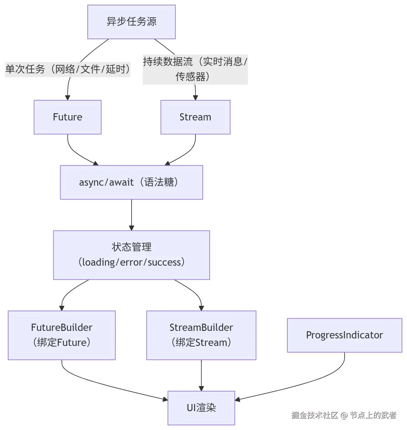 Future、async/await处理单次异步任务(如一次网络请求); - UI 层:通过