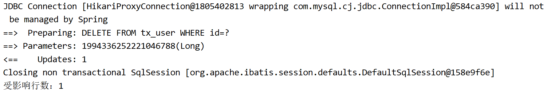 queryWrapper.eq("name", name);//DELETE FROM user WHERE name = 'abc'; int deletedCount = userMapper.delete(queryWrapper); System.out.println("成功删除了 " + deletedCount + " 条记录。");}