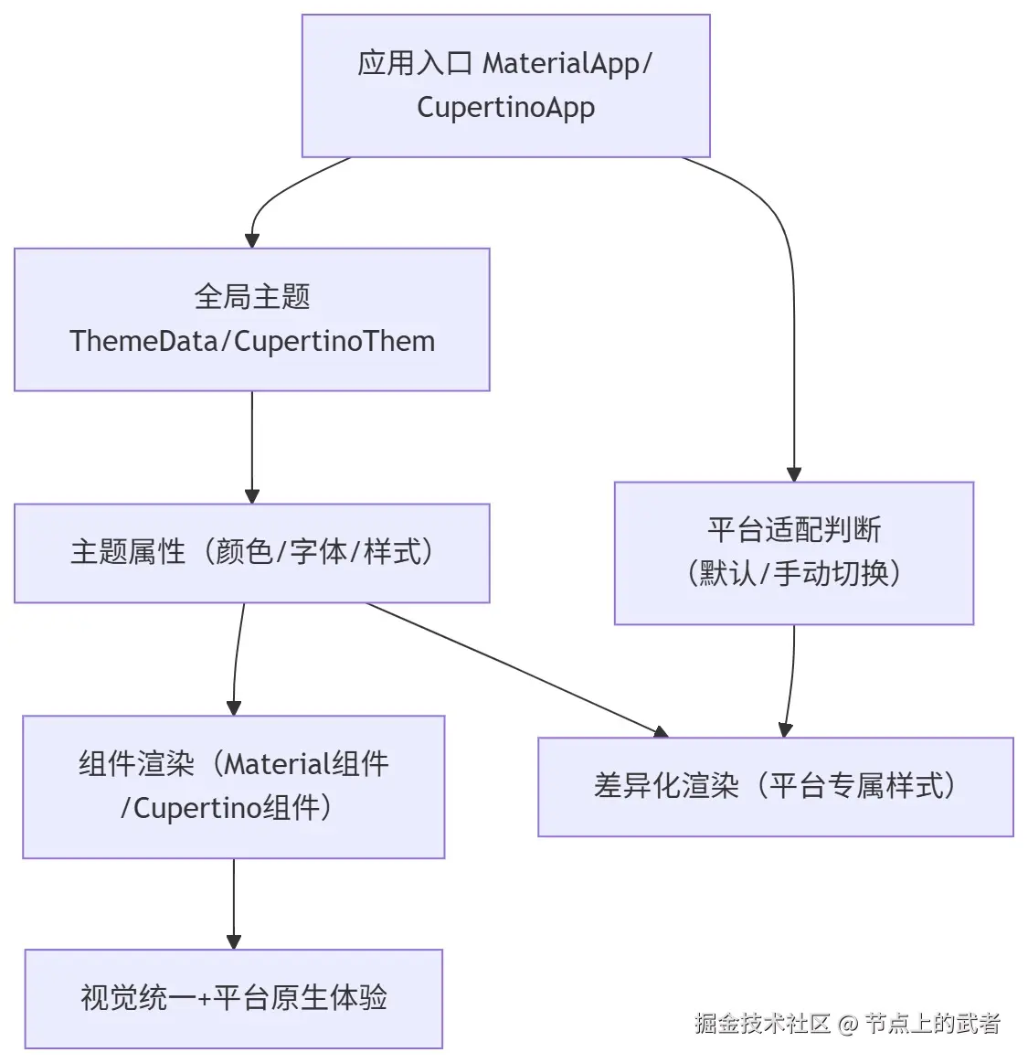 - 核心层:全局主题(ThemeData/CupertinoThemeData)是风格统一的核心,存储全局共享的颜色、字体、组件样式;