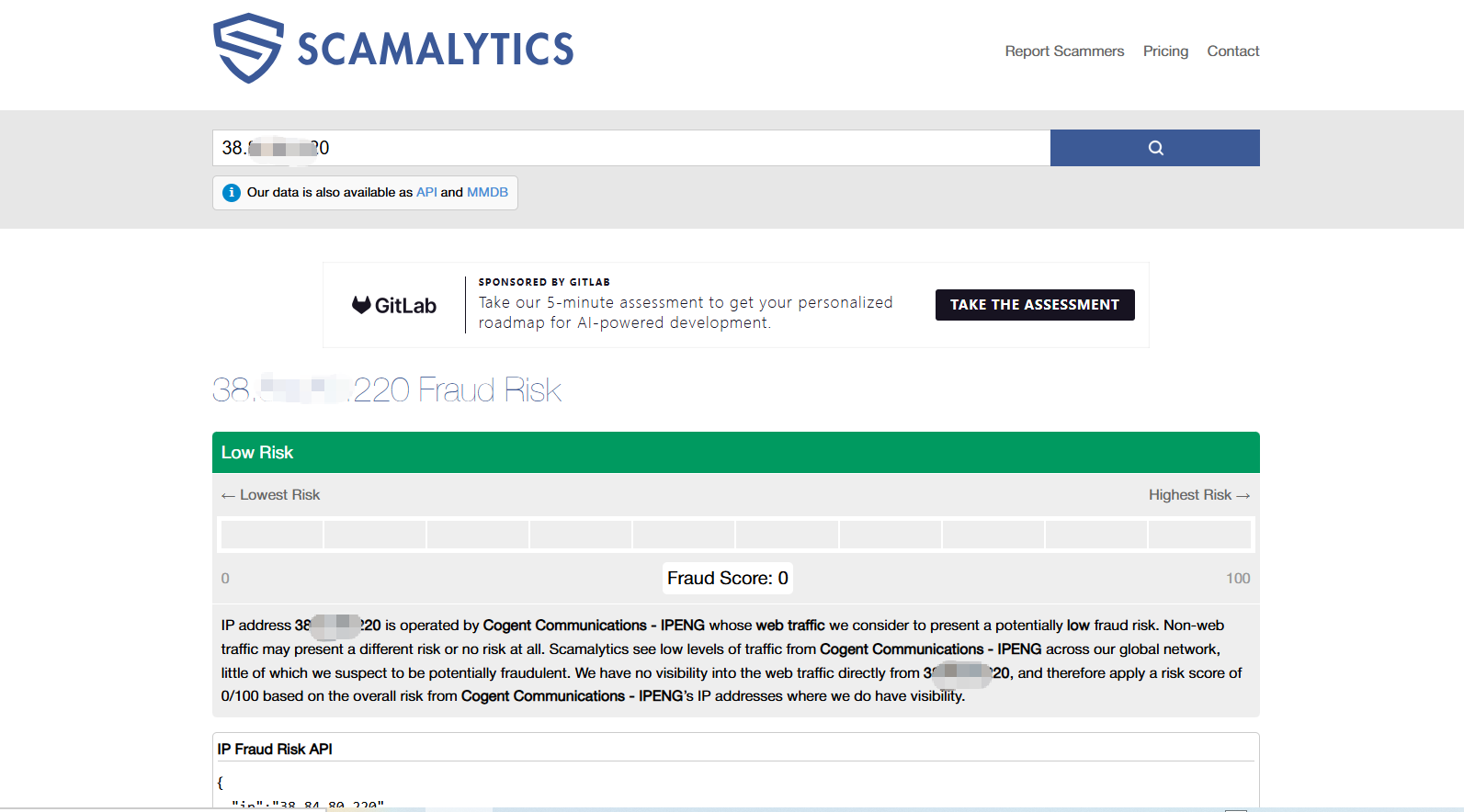 通过 IPQualityScore、Scamalytics等工具获取 IP 综合评分判断是否为高风险IP,例如: