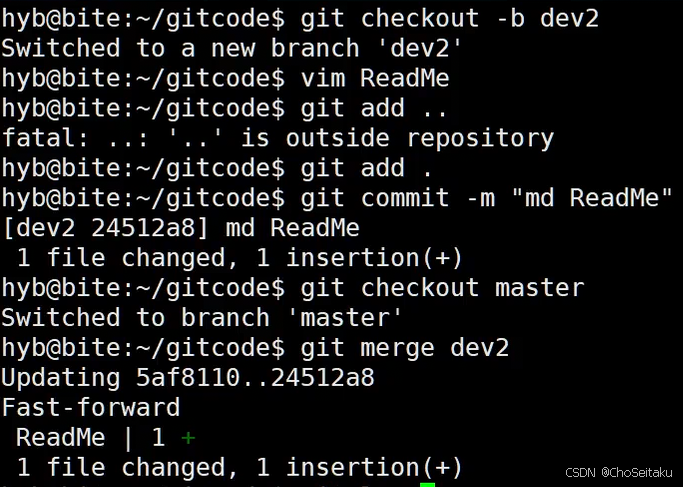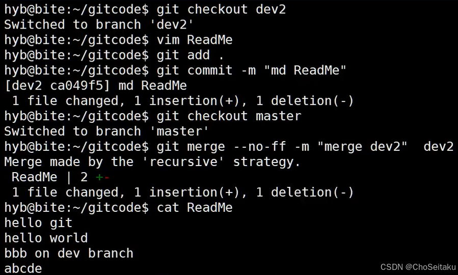 在 dev 分⽀下修改ReadMe⽂件,新增⼀⾏内容,并进⾏⼀次提交操作