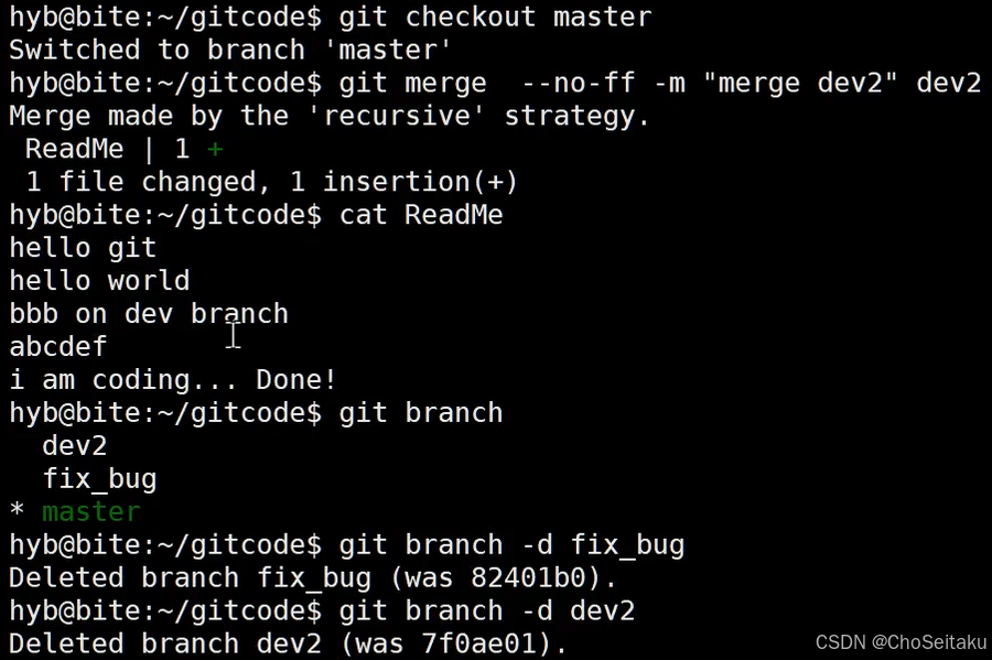 修复完成后,切换到 master 分⽀,并完成合并,最后删除 fix_bug 分⽀