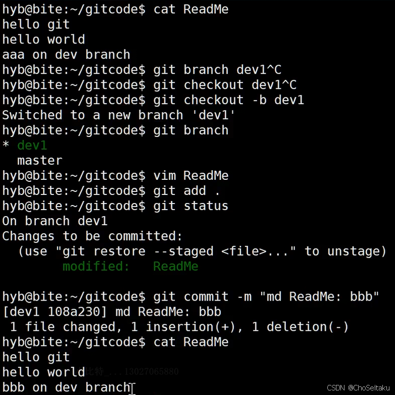 在 dev1 分⽀下修改 ReadMe ⽂件,更改⽂件内容如下,并进⾏⼀次提交