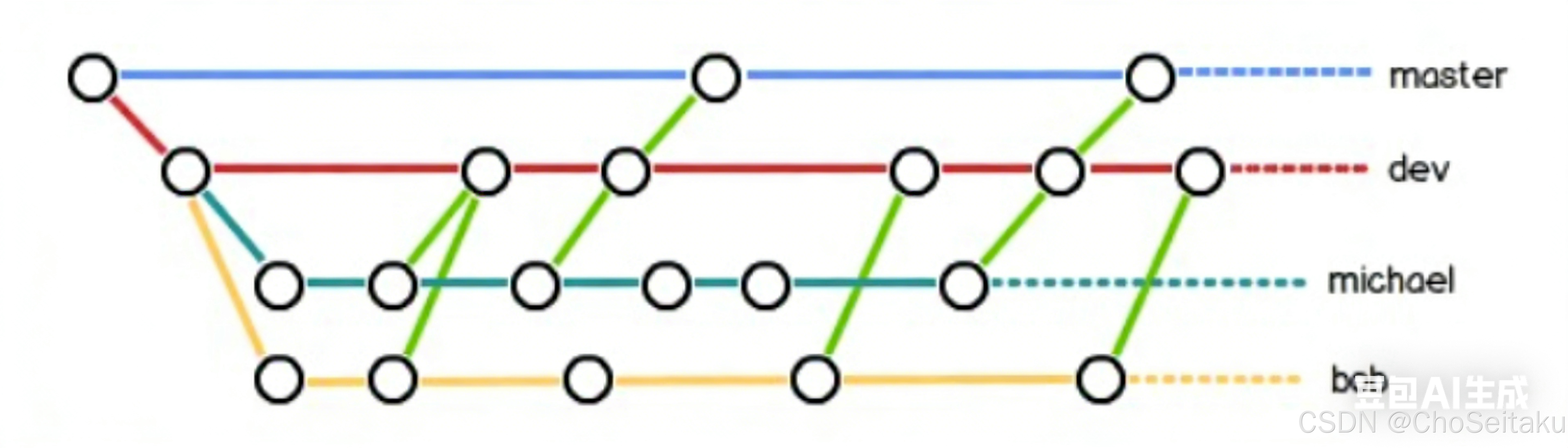 那么这就不是 Fast forward 模式了,这样的好处是,从分⽀历史上就可以看出分⽀信息。例如已经删除了在合并冲突部分创建的 dev1 分⽀,但依旧能看到master其实是由其他分⽀合并得到