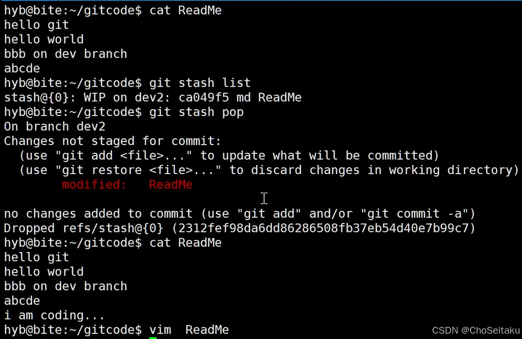 另外,恢复现场也可以采⽤ git stash apply 恢复,但是恢复后,stash内容并不删除,需要⽤ git stash drop 来删除;