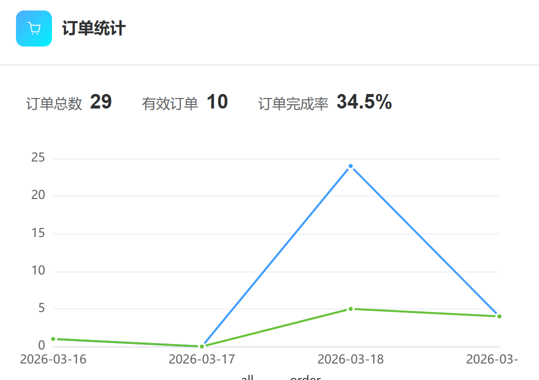 展示所选时间区间内的有效订单数、总订单数、订单完成率、订单完成率=有效订单数/总订单数*100%
