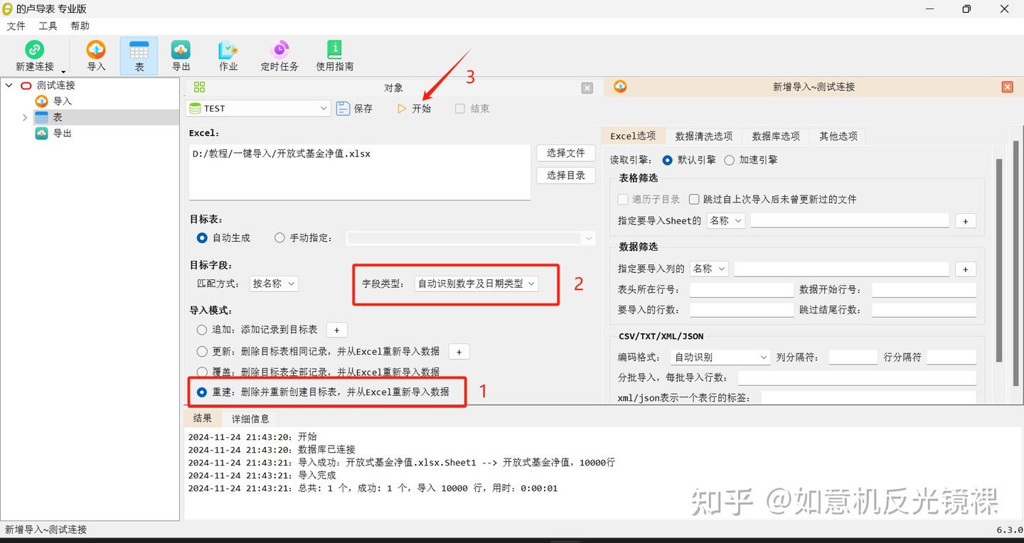 选择重建模式-字段类型选择自动识别数字及日期类型,点击开始重新导入