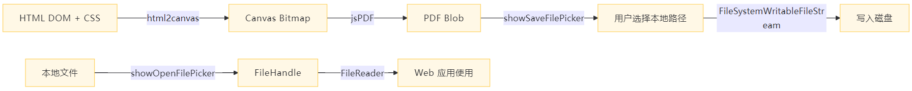 在传统的 Web 应用中,生成并下载 PDF 通常需要后端服务的支持------前端发送 HTML 内容,后端使用 Puppeteer 或wkhtmltopdf 渲染后返回文件流。但在现代浏览器中,我们可以借助 html2pdf.js 与 File System Access API 构建一个纯前端、零服务端的 PDF 生成与保存方案,甚至可以让用户通过原生对话框自主选择保存路径。
