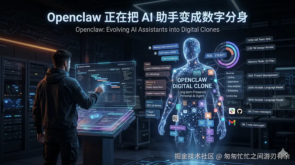 它给人的感觉更像是:大家突然第一次看到了"个人 AI Agent"真正长成产品雏形的样子。 很多人第一次看到 Openclaw,都会下意识产生一种非常强烈的感觉: 这东西已经不像一个普通 AI 助手了,它更像一个开始具备"长期存在感"的数字分身。 它不仅能聊天,还能: