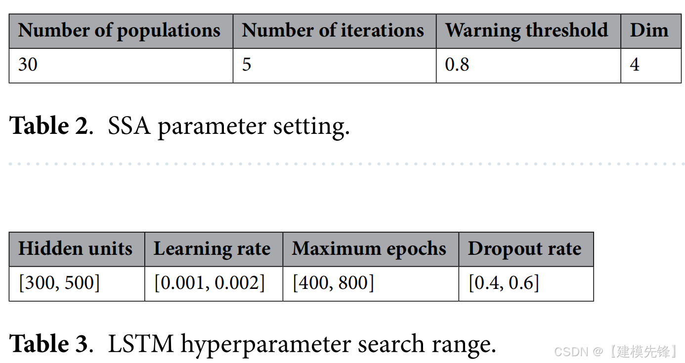 本文采用SSA算法对网络结构的这些主要超参数进行了优化。使用SSA优化LSTM网络超参数的过程如图所示。所采用的SSA参数如表2所示,LSTM超参数优化的范围如表3所示。