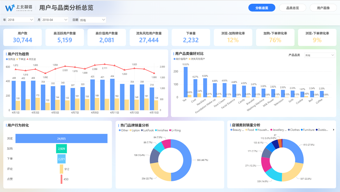 直接展示高活跃/高价值/流失风险用户数,以及各环节转化率。业务态势是好是坏,一眼便知。 -