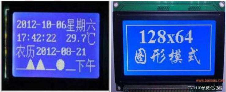 这种显示屏跟1602也是有区别的,比如,LCD12864它是以像素点的,128 * 64个像素点,而1602它是字符型一个液晶屏,它显示是由5 * 7或者5 * 10为一个字符,在字符与字符之间有一个间隔,而且行与行之间也有一个间隔,所以对于1602来说,它不能完整显示一幅图,因为它的每一个字符与每一个字符都有一个间隙,而12864是完整的像素点,也就是说在显示屏上面,一行有128个像素点,总共有64行,它是构成完整的像素点,那么可以根据要显示的东西进行点亮或者熄灭,这就可以显示完整的图像了,通常显示一个汉字需要16 * 16个像素点,因此根据12864是128*64个像素点的话,所以一行可以显示128 / 16 = 8个汉字,可以显示64 / 16 = 4行,一个汉字是2个字节,一个字符是一个字节,所以一个汉字相当于2个字符,从上面左边图也可以看出第一行是2012-10-06,这里两个字符相当于可以显示一个汉字,20一个汉字,12一个汉字,-1一个汉字,0- 一个汉字,06一个汉字,字符这里相当于可以显示5个汉字加上后面星期六,三个汉字,一共8个汉字,一共显示了4行。