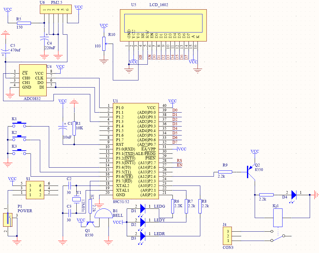 由51单片机+ADC0832+GP2Y1010AUPM2.5传感器+按键+LED及蜂鸣器构成。