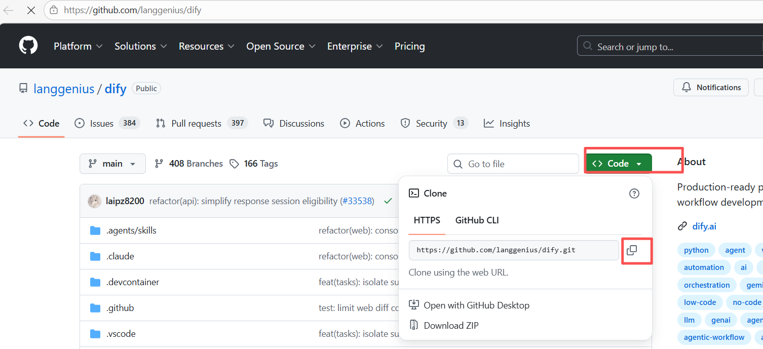 或者直接点击链接:GitHub - langgenius/dify: Production-ready platform for agentic workflow development. · GitHub