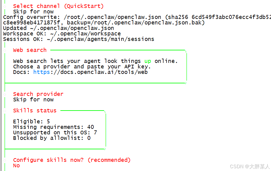 Configure skills now? (recommended) 现在需要配置技能也直接跳过(后续可单独配)