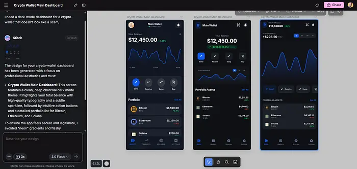 **提示词到产品只需几秒:**你可以直接输入"为加密货币钱包设计一个深色模式仪表盘,但不能看起来像'我们肯定是骗局'",Stitch会生成一些......实际上可用的东西。不完美,但可用。