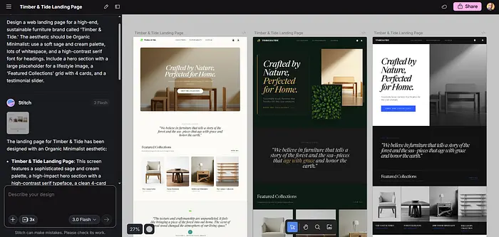 说实话:如果你只是告诉Stitch"给我做一个着陆页",你会得到一个看起来像2014年由一群机器人设计的东西。