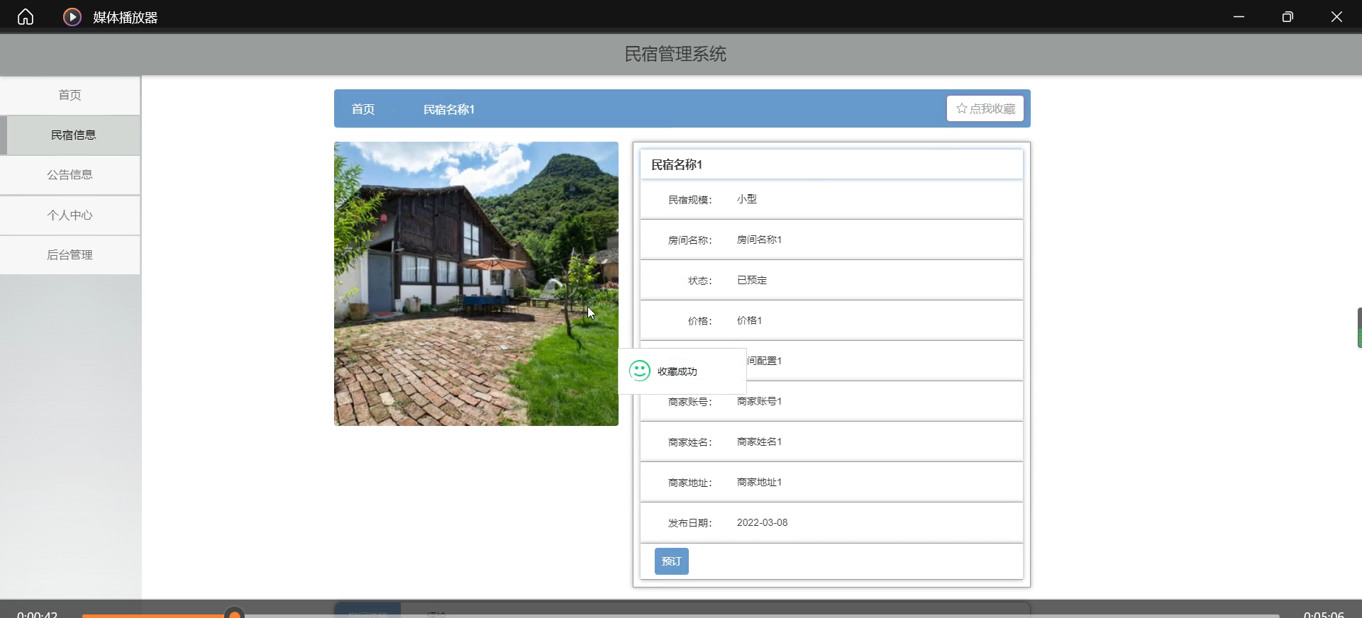 (3)应用成果: 系统能够有效支撑民宿业务流程,提高商家管理效率50%以上,缩短用户预订流程,具有良好的实用价值和推广前景,可作为民宿行业信息化管理的参考案例。