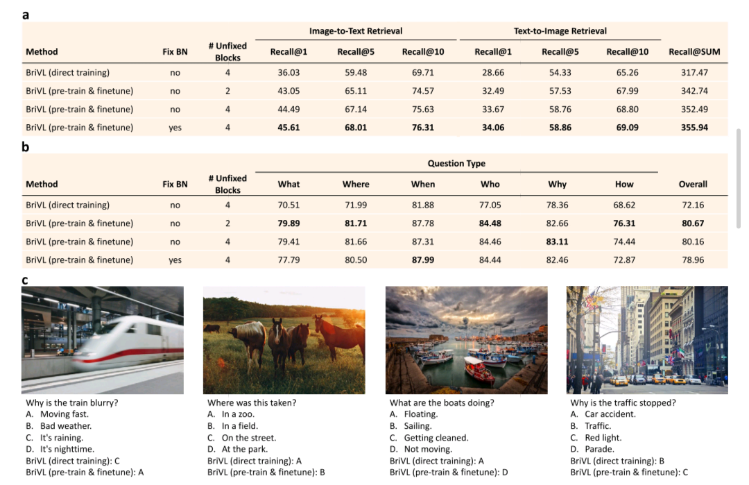 更重要的是,通过VQA示例分析,预训练的BriVL展现出了强大的想象能力和常识推理能力。例如,模型知道图片中的火车看起来模糊是因为它在快速移动,马的照片是在田野而不是动物园拍摄的,系在码头上的船是静止的而不是漂浮的,交通停止是因为红灯而不是堵车。这种能力是通过弱语义关联数据预训练获得的------文本不是图像的详细描述,模型需要在预训练过程中发现隐藏在弱关联中的复杂联系。