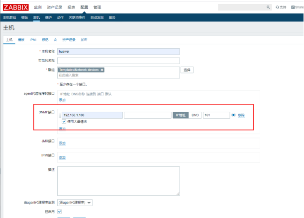 Huawei\] snmp-agent \[Huawei\] snmp-agent community read zabbix@000000 \[Huawei\] snmp-agent sys-info version all \[Huawei\] snmp-agent target-host inform address udp-domain 192.168.1.110 udp-port 161 \[Huawei\] params securityname zabbix@000000 v2c //server端的内网ip \[Huawei\] snmp-agent trap enable Warning: All switches of SNMP trap/notification will be open. Continue? \[Y/N\]:y \[root@server \~\]# yum install net-snmp\* -y \[root@server \~\]# systemctl start snmpd \[root@server \~\]# systemctl enable snmpd Created symlink from /etc/systemd/system/multi-user.target.wants/snmpd.service to /usr/lib/systemd/system/snmpd.service. \[root@server \~\]# snmpwalk -v 2c -c zabbix@000000 192.168.1.100 system //交换机地址 SNMPv2-MIB::sysDescr.0 = STRING: S5700-28C-HI Huawei Versatile Routing Platform Software VRP (R) software,Version 3.30 (S5700 V200R001C00) Copyright (C) 2007 Huawei Technologies Co., Ltd. SNMPv2-MIB::sysObjectID.0 = OID: SNMPv2-SMI::enterprises.2011.2.23.169 DISMAN-EVENT-MIB::sysUpTimeInstance = Timeticks: (54612) 0:09:06.12 SNMPv2-MIB::sysContact.0 = STRING: R\&D Beijing, Huawei Technologies co.,Ltd. SNMPv2-MIB::sysName.0 = STRING: Huawei SNMPv2-MIB::sysLocation.0 = STRING: Beijing China SNMPv2-MIB::sysServices.0 = INTEGER: 78