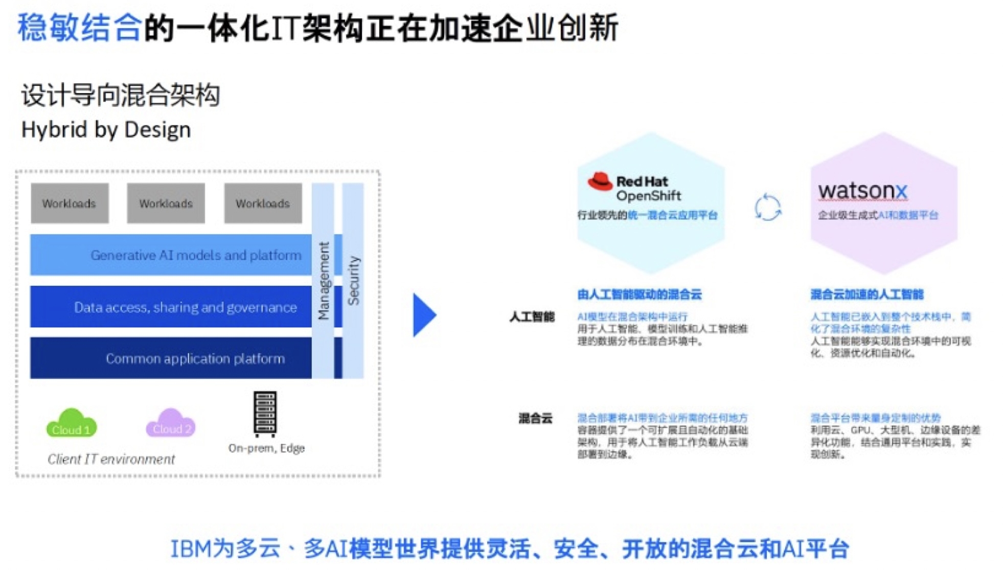 毫无疑问,我们今天正在经历企业IT范式的深刻变革。IBM首席执行官 Arvind Krishna曾预计在未来几年内将有逾十亿个新应用借助生成式AI构建而成,但如何用一个新的IT平台和相关工具,帮助企业打破传统的孤岛式IT系统,转而以云化方式管理全球异构IT资源,同时向大模型和智能体提供云化IT资源,支持随时快速上线下线新的AI项目,支持生成上万的新应用,为新应用提供全局实时智能,这就是企业IT范式变革的意义,也是过去七年IBM在布局的一盘大棋。