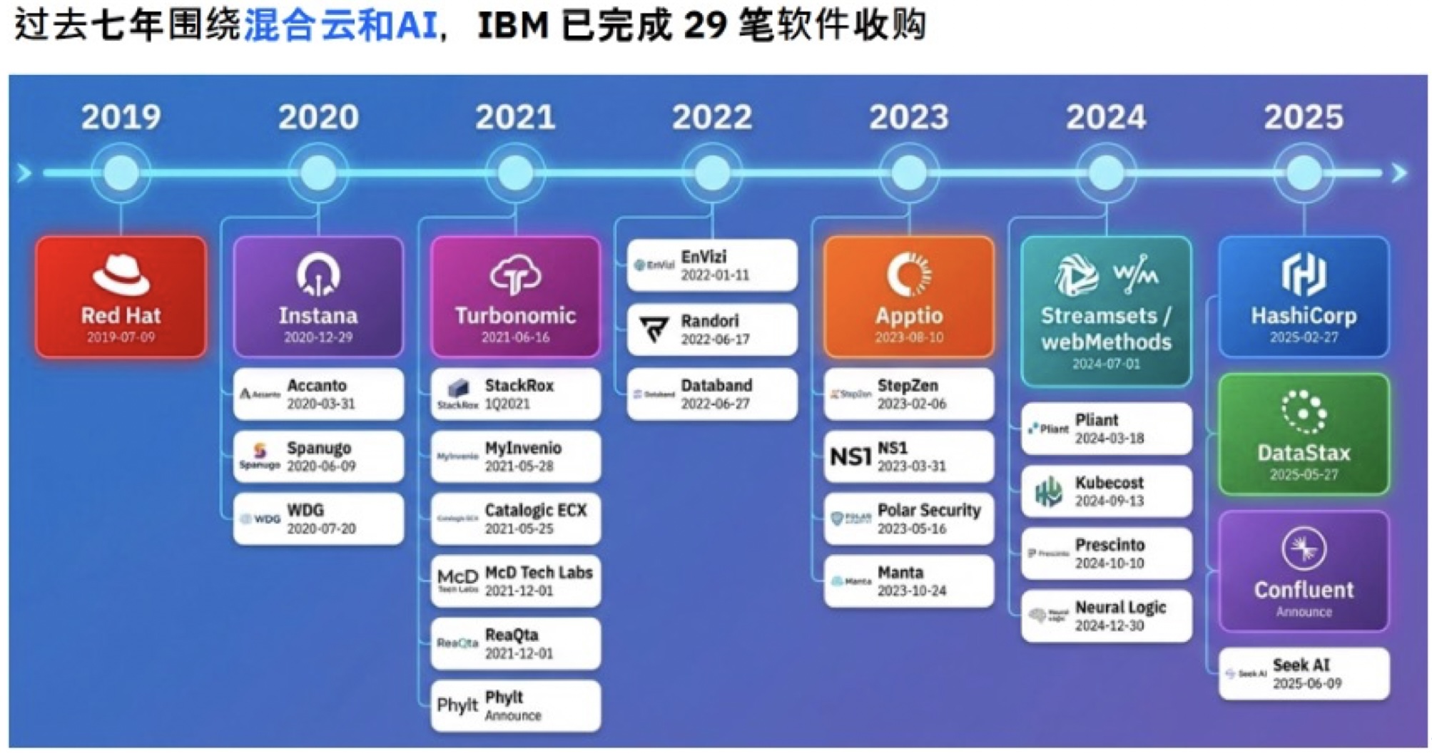 过去7年,IBM围绕混合云和AI进行了29次收购,直到刚刚完成收购的实时数据流服务商Confluent,基本完成了面向实时智能的下一代企业IT范式的布局。
