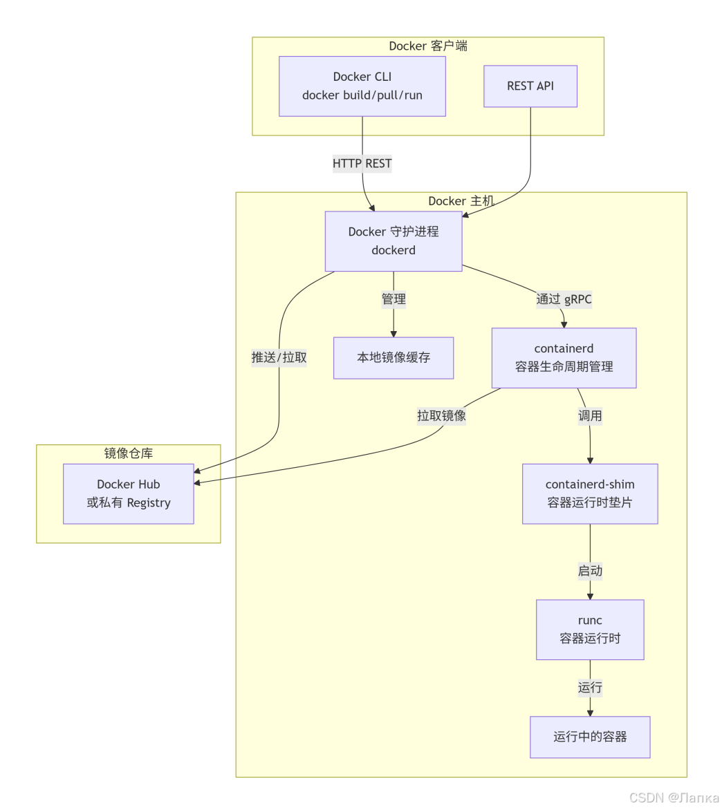 C/S 架构中的服务端(守护进程),负责创建和管理容器、镜像、网络等。它是 Docker 的核心运行环境。