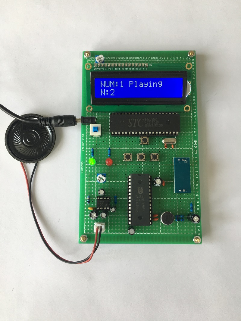 由51单片机+ISD4004录音芯片+LM386功放模块+小喇叭+LCD1602+按键+指示灯+电源构成
